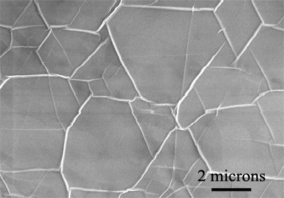 Copper foil thickness: 20 micron We offer graphene films that are predominantly single-layer graphene. These graphene films are grown on copper foil and continuous across copper surface steps and grain boundaries. Graphene is grown on both sides of the copper foil. If you require specifically graphene on one side only, please contact us directly. Etching of the underlying copper foil allows the carbon films to be transferred to other substrates such as glass, silicon dioxide or plastic films. To the best of our knowledge, there is no report of degradation of the CVD graphene over time when it is kept in a safe, dry place. The copper foil with single-layer graphene can exhibit some coloration due to slow oxidation of the copper foil, which does not affect the quality of the graphene film. 典型SEM圖像 |